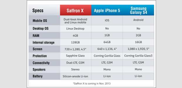 La compagnia indiana SmartNamo ha diffuso una scheda dettagliata delle specifiche in cui compare il suo prossimo device, Saffron X, “affrontare” Samsung Galaxy S4 ed IPhone 5. Dando un’occhiata al comparto hardware, a chiunque di vuoi potrebbe tornare in mente il progetto ambizioso di Ubuntu Edge annunciato alcune settimane fa ma che in mancanza di adeguati finanziamenti non è decollato.