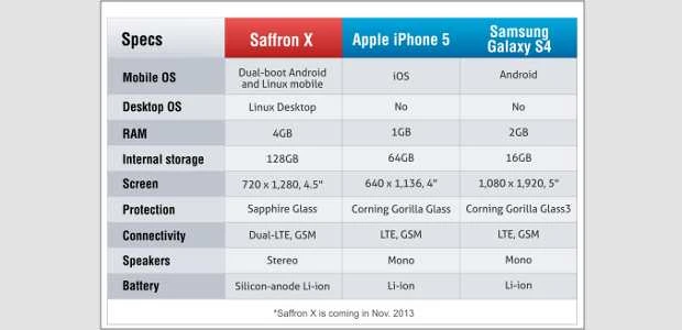La compagnia indiana SmartNamo ha diffuso una scheda dettagliata delle specifiche in cui compare il suo prossimo device, Saffron X, “affrontare” Samsung Galaxy S4 ed IPhone 5. Dando un’occhiata al comparto hardware, a chiunque di vuoi potrebbe tornare in mente il progetto ambizioso di Ubuntu Edge annunciato alcune settimane fa ma che in mancanza di adeguati finanziamenti non è decollato.