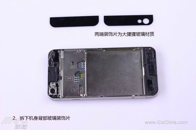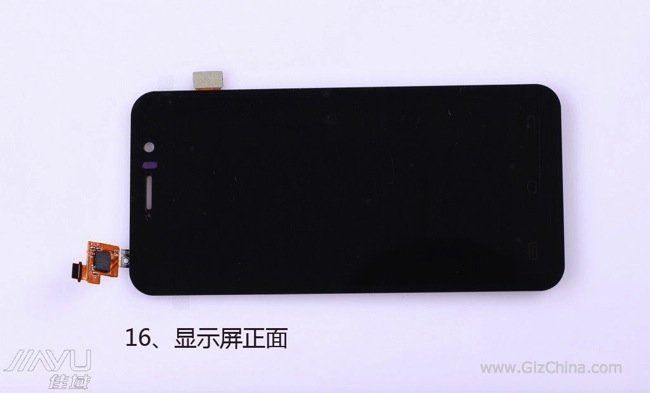 Lo schermo dello JiaYu G5 è molto simile nella forma a quello delliPhone 5 ed è incollato al pannello frontale in vetro. Da questa foto è possibile vedere, inoltre, che il JiaYu G5 non ha alcun pulsante HOME fisico.