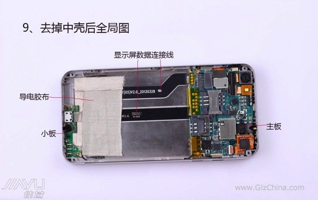 Questo è il JiaYu G5 completamente smontato. Il processo non sembra poi così difficile e potrebbe significare che alcune riparazioni potrebbero essere effettuate a casa (se vi sentite coraggiosi).