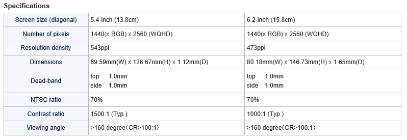 La compagnia ha messo a punto due pannelli Quad-HD rispettivamente di 5.4 e 6.2 pollici, entrambi con risoluzione di 2560×1440.