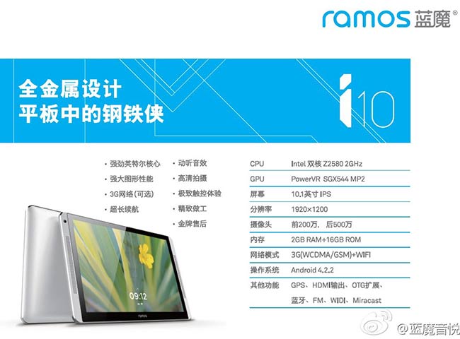 Il display da 10.1 pollici del Ramos i10 ha una risoluzione di 1920 x 1200 pixel, ovvero superiore alla risoluzione FULLHD 1080p. Sul tablet è preinstallato Android 4.2.2. Jelly Bean e compreso il supporto 3G (WCDMA / GSM), WiFi, GPS e OTG.