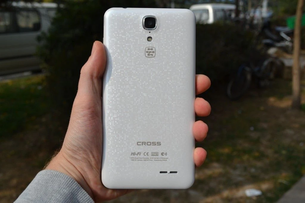 Ruotando il telefono, vediamo il famoso pannello a griglia. E’ presente una versione anche in blu scuro, ma la bianca è la nostra preferita. La fotocamera posteriore da 13 mega-pixel con apertuta F2.2 si trova nella parte superiore assieme ad un singolo flash LED appena sotto. Possiamo vedere il logo di Aliyun OS anche se la versione internazionale avrà una ROM standard targata UMI. Nella parte inferiore troviamo il logo Cross, il marchio CE, altri dettagli ed una griglia dell’altoparlante.