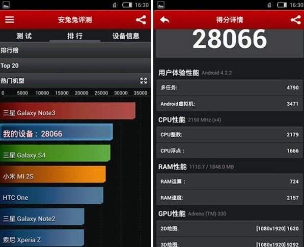 Il Samsung Galaxy Note 3 fa registrare circa 5000 punti in più dei 28066 del Nubia Z5S; lo Z5S con Snapdragon 600 si classifica dietro ad un tot di device con il medesimo chipset, tra cui anche lo Xiaomi MI2S.