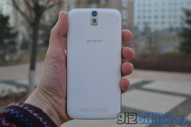 La finitura in pelle stampa sul retro della Zopo sembra buona, sia da un punto di vista estetico che da quello del grip. La parte posteriore ha anche un grande altoparlante esterno, logo Zopo e una fotocamera posteriore da 14 megapixel e flash LED situato in alto al centro.