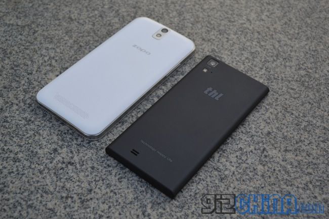Nonostante il display dello Zopo ZP998 sia più grande, le dimensioni tra i due telefoni non differiscono eccessivamente. Quelle dello Zopo ZP998 sono di 151,4 x 76,1 x 9,1 millimetri, mentre quelle del THL T100S di 144,3 x 70,4 x 8,4 millimetri.