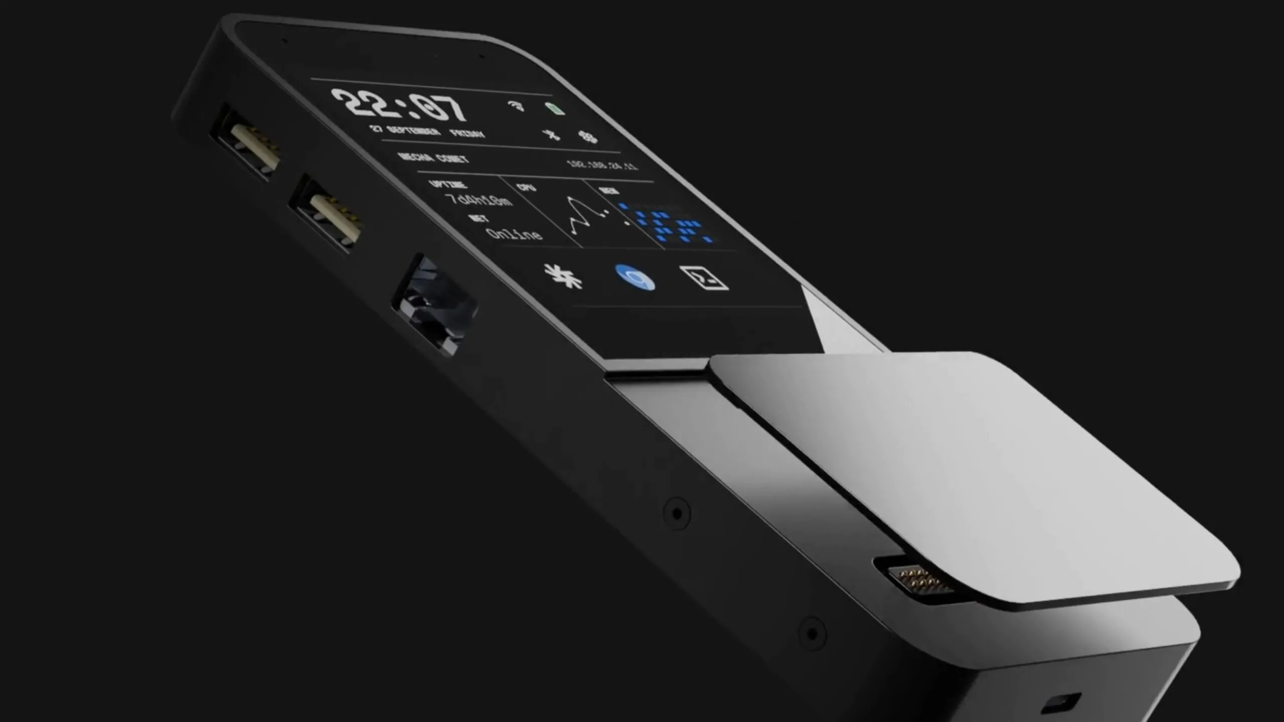 È qui che il Mecha Comet propone la sua rivoluzione. Nonostante sia ancora un prototipo in attesa di finanziamento, questo dispositivo si presenta come un computer Linux tascabile che giustifica il suo spessore con una dotazione di porte I/O eccellente e un sistema modulare ingegnoso.