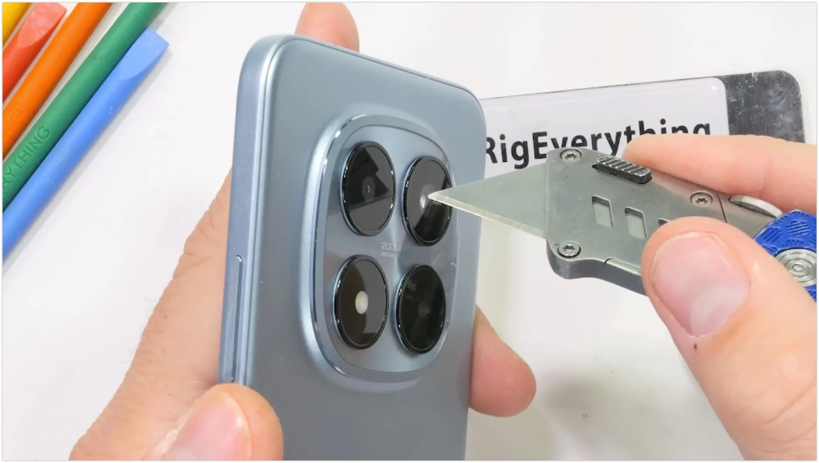 Il primo passaggio riguarda la resistenza ai graffi: lo schermo – protetto da Gorilla Glass Victus 2 – inizia a graffiarsi al livello 6 della scala di Mohs, con solchi più profondi al livello 7. Il telefono si posiziona al pari dei flagship più costosi; inoltre il lettore d’impronte digitali sotto lo schermo continua a funzionare anche dopo essere stato graffiato pesantemente.