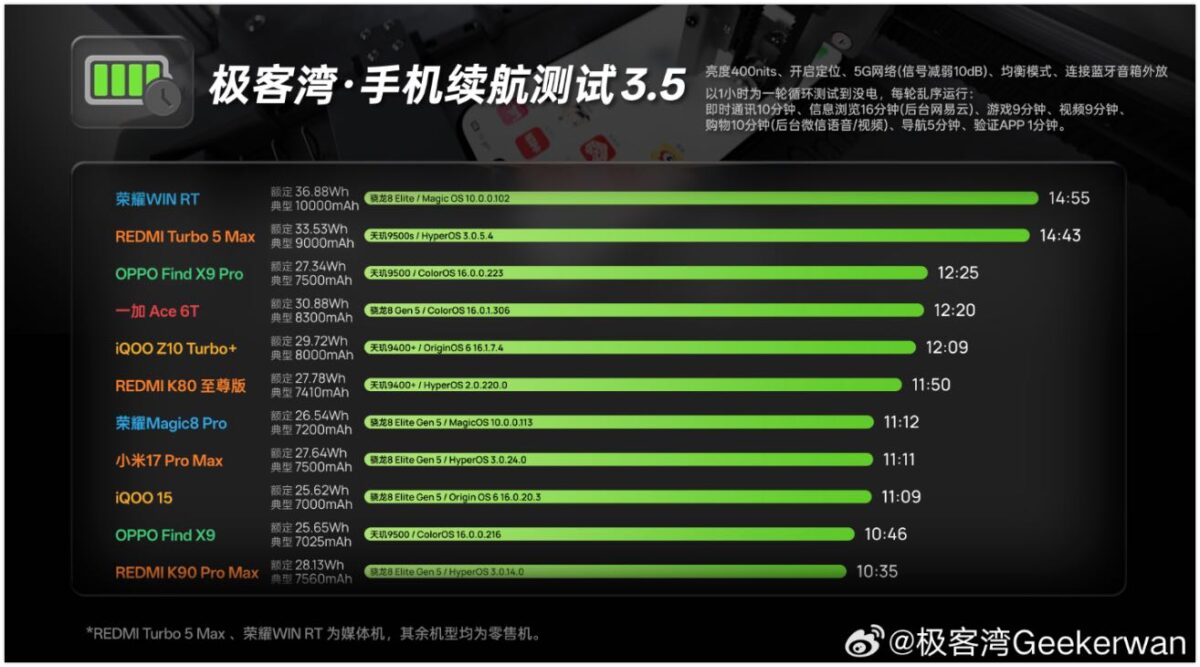 Lo smartphone Redmi è stato protagonista dei primi test della batteria: si parla di quasi 15 ore di autonomia con un utilizzo standard, un risultato in linea con quello ottenuto da Honor Win RT sulla stessa piattaforma. Ricordiamo che quest’ultimo è equipaggiato con una 10.000 mAh – contro i 9.000 mAh di Turbo 5 Max – quindi il risultato raggiunto da Xiaomi sarebbe davvero ottimo.