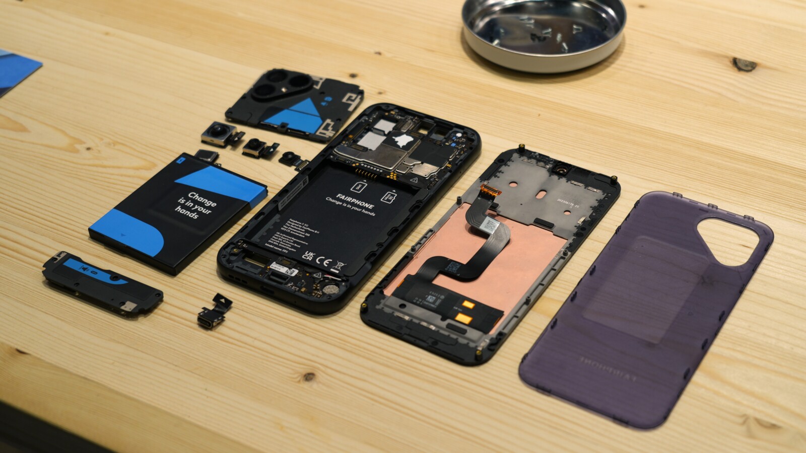Fairphone smontato su un tavolo